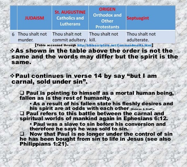 - 11. 7/13/2019 Produced by Bill Fritz for Adult Sunday School 11 [Table accessed through http://biblescripture.net/Commandments.html] As shown in the table above the order is not the same and the words may differ but the spirit is the same. Paul continues in verse 14 by say “but I am carnal, sold under sin”. Paul is pointing to himself as a mortal human being, fallen as is the rest of humanity. As a result of his fallen state, his fleshly desires and his spirit are at odds with each other (Holman & Staff). Paul refers to this battle between the carnal and spiritual worlds of mankind again in Ephesians 6:12. Paul was a slave to sin before his conversion and therefore he says he was sold to sin. Now that Paul is no longer under the control of sin he has been bought from sin to life in Jesus (see also Philippians 1:21).