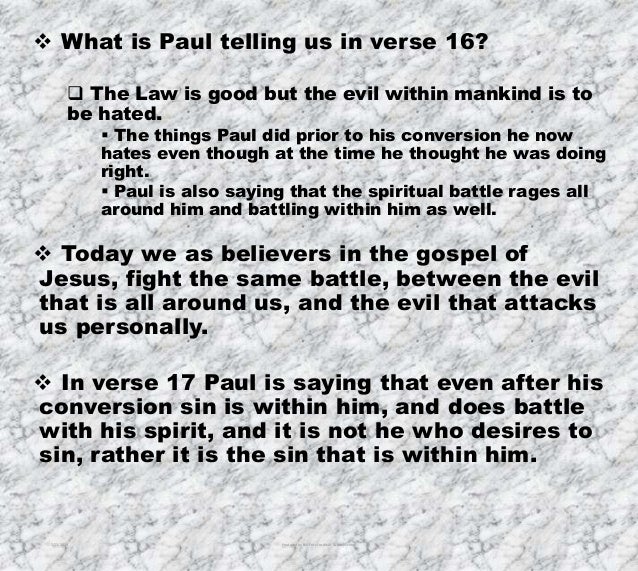 - 12. 7/13/2019 Produced by Bill Fritz for Adult Sunday School 12 What is Paul telling us in verse 16? The Law is good but the evil within mankind is to be hated. The things Paul did prior to his conversion he now hates even though at the time he thought he was doing right. Paul is also saying that the spiritual battle rages all around him and battling within him as well. Today we as believers in the gospel of Jesus, fight the same battle, between the evil that is all around us, and the evil that attacks us personally. In verse 17 Paul is saying that even after his conversion sin is within him, and does battle with his spirit, and it is not he who desires to sin, rather it is the sin that is within him.