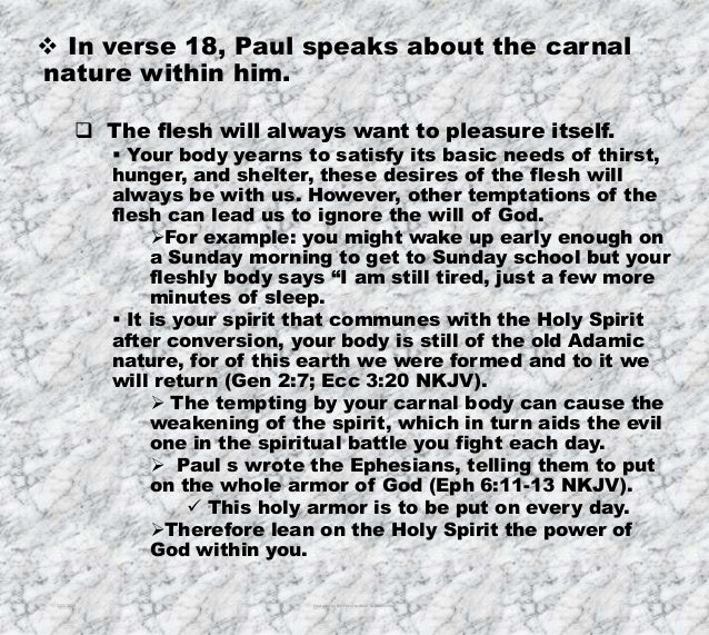 - 13. 7/13/2019 Produced by Bill Fritz for Adult Sunday School 13 In verse 18, Paul speaks about the carnal nature within him. The flesh will always want to pleasure itself. Your body yearns to satisfy its basic needs of thirst, hunger, and shelter, these desires of the flesh will always be with us. However, other temptations of the flesh can lead us to ignore the will of God. For example: you might wake up early enough on a Sunday morning to get to Sunday school but your fleshly body says “I am still tired, just a few more minutes of sleep. It is your spirit that communes with the Holy Spirit after conversion, your body is still of the old Adamic nature, for of this earth we were formed and to it, we will return (Gen 2:7; Ecc 3:20 NKJV). The tempting by your carnal body can cause the weakening of the spirit, which in turn aids the evil one in the spiritual battle you fight each day. Paul wrote the Ephesians, telling them to put on the whole armor of God (Eph 6:11-13 NKJV). This holy armor is to be put on every day. Therefore lean on the Holy Spirit the power of God within you.