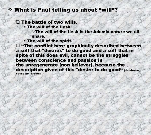 - 14. 7/13/2019 Produced by Bill Fritz for Adult Sunday School 14 What is Paul telling us about “will”? The battle of two wills. The will of the flesh. The will of the flesh is the Adamic nature we all share. The will of the spirit. “The conflict here graphically described between a self that "desires" to do good and a self that in spite of this does evil, cannot be the struggles between conscience and passion in the unregenerate [non believer], because the description given of this "desire to do good“ (Jamieson, Fausette, Brown)