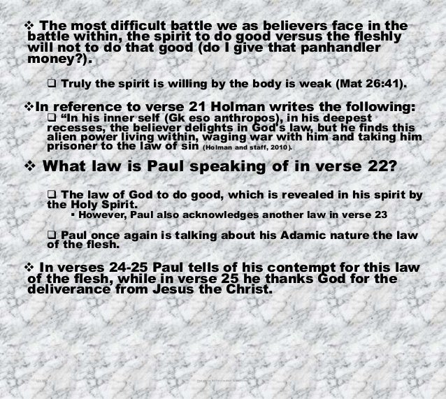- 16. 7/13/2019 Produced by Bill Fritz for Adult Sunday School 16 The most difficult battle we as believers face in the battle within, the spirit to do good versus the fleshly will not to do that good (do I give that panhandler money?). Truly the spirit is willing by the body is weak (Mat 26:41). In reference to verse 21 Holman writes the following: “In his inner self (Gk eso anthropos), in his deepest recesses, the believer delights in God's law, but he finds this alien power living within, waging war with him and taking him prisoner to the law of sin (Holman and staff, 2010). What law is Paul speaking of in verse 22? The law of God to do good, which is revealed in his spirit by the Holy Spirit. However, Paul also acknowledges another law in verse 23 Paul once again is talking about his Adamic nature the law of the flesh. In verses, 24-25 Paul tells of his contempt for this law of the flesh, while in verse 25 he thanks God for the deliverance from Jesus the Christ.