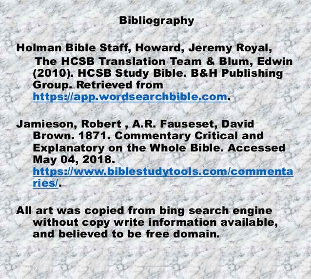 - 17. 7/13/2019 Produced by Bill Fritz for Adult Sunday School 17 Bibliography Holman Bible Staff, Howard, Jeremy Royal, The HCSB Translation Team & Blum, Edwin (2010). HCSB Study Bible. B&H Publishing Group. Retrieved from https://app.wordsearchbible.com. Jamieson, Robert , A.R. Fauseset, David Brown. 1871. Commentary Critical and Explanatory on the Whole Bible. Accessed May 04, 2018. https://www.biblestudytools.com/commenta ries/. All art was copied from bing search engine without copy write information available, and believed to be free domain.