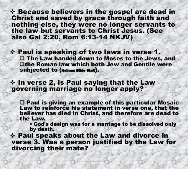 - 3. 7/13/2019 Produced by Bill Fritz for Adult Sunday School 3 Because believers in the gospel are dead in Christ and saved by grace through faith and nothing else, they were no longer servants to the law but servants to Christ Jesus. (See also Gal 2:20, Rom 6:13-14 NKJV) Paul is speaking of two laws in verse 1. The Law handed down to Moses to the Jews and the Roman law which both Jew and Gentile were subjected to (Holman Bible Staff). In verse 2, is Paul saying that the Law governing marriage no longer apply? Paul is giving an example of this particular Mosaic Law to reinforce his statement in verse one, that the believer has died in Christ, and therefore are dead to the Law. God’s design was for a marriage to be dissolved only by death. Paul speaks about the Law and divorce in verse 3. Was a person justified by the Law for divorcing their mate?