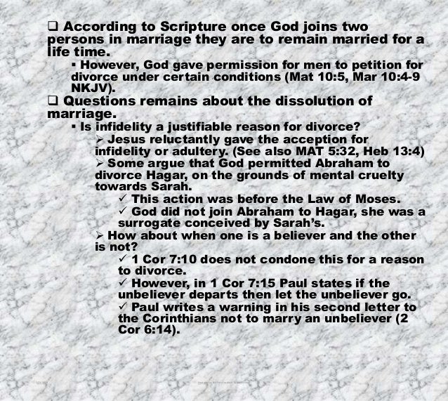 - 4. 7/13/2019 Produced by Bill Fritz for Adult Sunday School 4 According to Scripture once God joins two persons in marriage they are to remain married for a lifetime. However, God gave permission for men to petition for divorce under certain conditions (Mat 10:5, Mar 10:4-9 NKJV). Questions remain about the dissolution of marriage. Is infidelity a justifiable reason for divorce? Jesus reluctantly gave the exception for infidelity or adultery. (See also MAT 5:32, Heb 13:4) Some argue that God permitted Abraham to divorce Hagar, on the grounds of mental cruelty towards Sarah. This action was before the Law of Moses. God did not join Abraham to Hagar, she was a surrogate conceived by Sarah’s. How about when one is a believer and the other is not? 1 Cor 7:10 does not condone this for a reason to divorce. However, in 1 Cor 7:15 Paul states if the unbeliever departs then let the unbeliever go. Paul writes a warning in his second letter to the Corinthians not to marry an unbeliever (2 Cor 6:14).