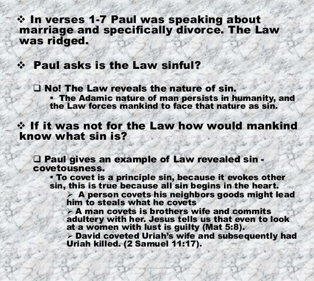 - 7. 7/13/2019 Produced by Bill Fritz for Adult Sunday School 7 In verses 1-7 Paul was speaking about marriage and specifically divorce. The Law was ridged. Paul asks is the Law sinful? No! The Law reveals the nature of sin. The Adamic nature of man persists in humanity, and the Law forces mankind to face that nature as sin. If it was not for the Law how would mankind know what sin is? Paul gives an example of Law revealed sin - covetousness. To covet is a principle sin, because it evokes other sin, this is true because all sin begins in the heart. A person covets his neighbors goods might lead him to steals what he covets A man covets is brothers wife and commits adultery with her. Jesus tells us that even to look at a woman with lust is guilty (Mat 5:8). David coveted Uriah’s wife and subsequently had Uriah killed. (2 Samuel 11:17).