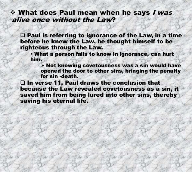 - 8. 7/13/2019 Produced by Bill Fritz for Adult Sunday School 8 What does Paul mean when he says I was alive once without the Law? Paul is referring to ignorance of the Law, in a time before he knew the Law, he thought himself to be righteous through the Law. What a person fails to know in ignorance, can hurt him. Not knowing covetousness was a sin would have opened the door to other sins, bringing the penalty for sin -death. In verse 11, Paul draws the conclusion that because the Law revealed covetousness as a sin, it saved him from being lured into other sins, thereby saving his eternal life.